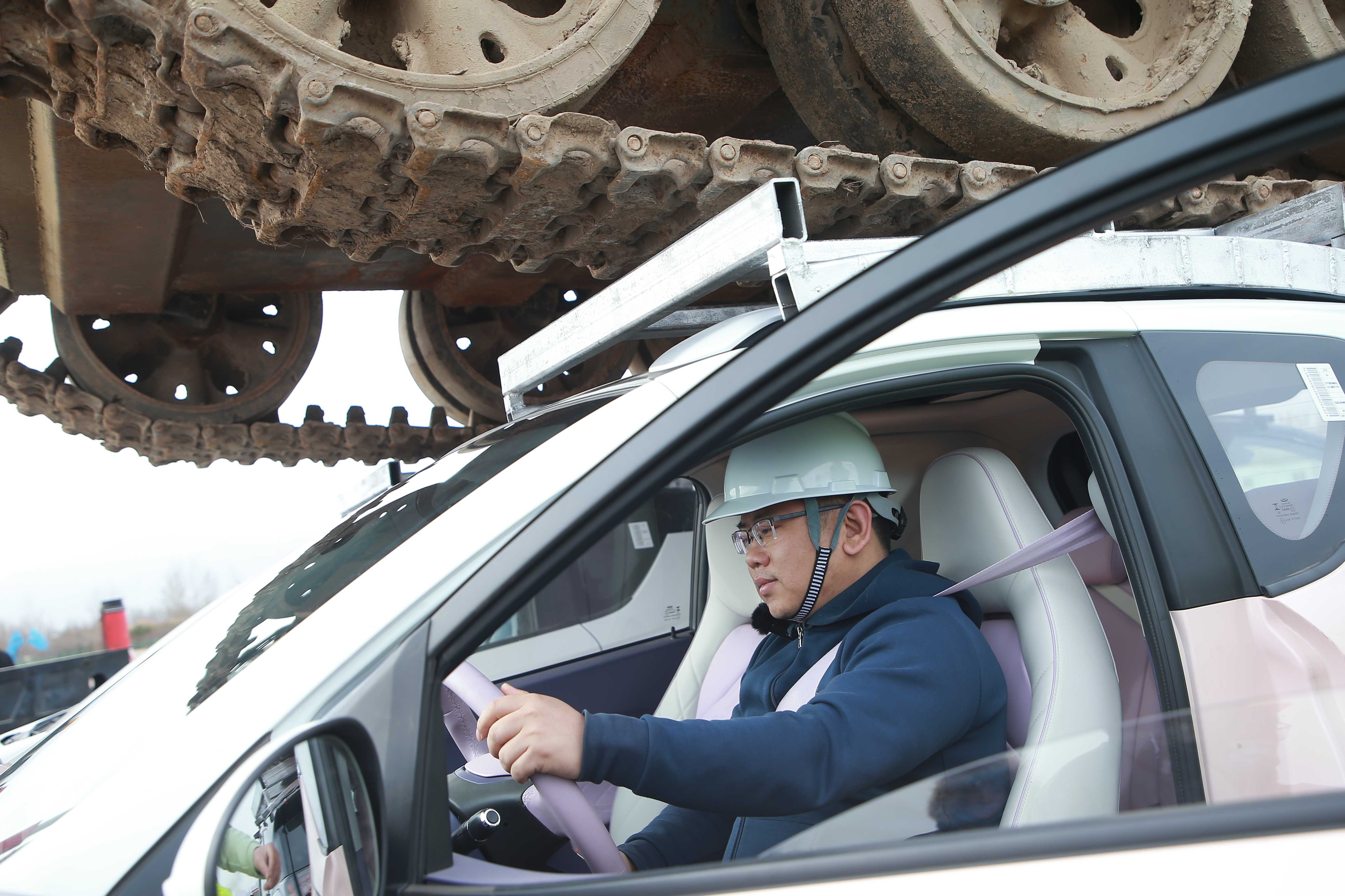 在奇瑞小蚂蚁“铝行舱”极限抗压挑战的活动现场,两台奇瑞小蚂蚁和两台奇瑞无界Pro背靠背停放,为保证能将承担的重量均衡分散到各车车身骨架上,硬核技术研究所工作人员还在四台车车顶安装了特制托架,随即一辆“T59坦克”重磅登场,将全身重量都释放压在这4台全铝车身工艺的纯电小车上。