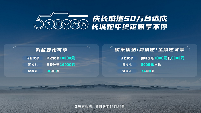 年末将至,长城炮年终钜惠重磅来袭:即日起至12月31日,购买山海炮乘用版、山海炮性能版、越野炮、乘用炮、商用炮、金刚炮、弹系列等车型,均可享受不同程度的优惠福利。