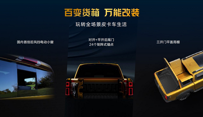 值得一提的是,山海炮性能版具备C6拖挂牵引资质,满足3.3吨拖车认证,能够拖拽房车、雪地机车等,充分满足用户的个性化需求。同时,后车箱预留了24个矩阵式锚点,用户可以结合自己的需求自由改装。车内外还配备了220V电源接口,可以满足各种小型电器的使用需求,让户外生活更加便利多样。