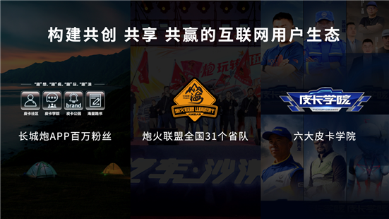 线上,长城炮创建行业首个专属APP,粉丝已破122万;线下,创建国内首个皮卡车友会炮火联盟,全国31个省队持续壮大;六大皮卡学院全面运营。长城炮正以全面 TO C的用户服务理念,与用户共建中国皮卡文化大本营,让皮卡成为一种生活、一种态度、一种精神。