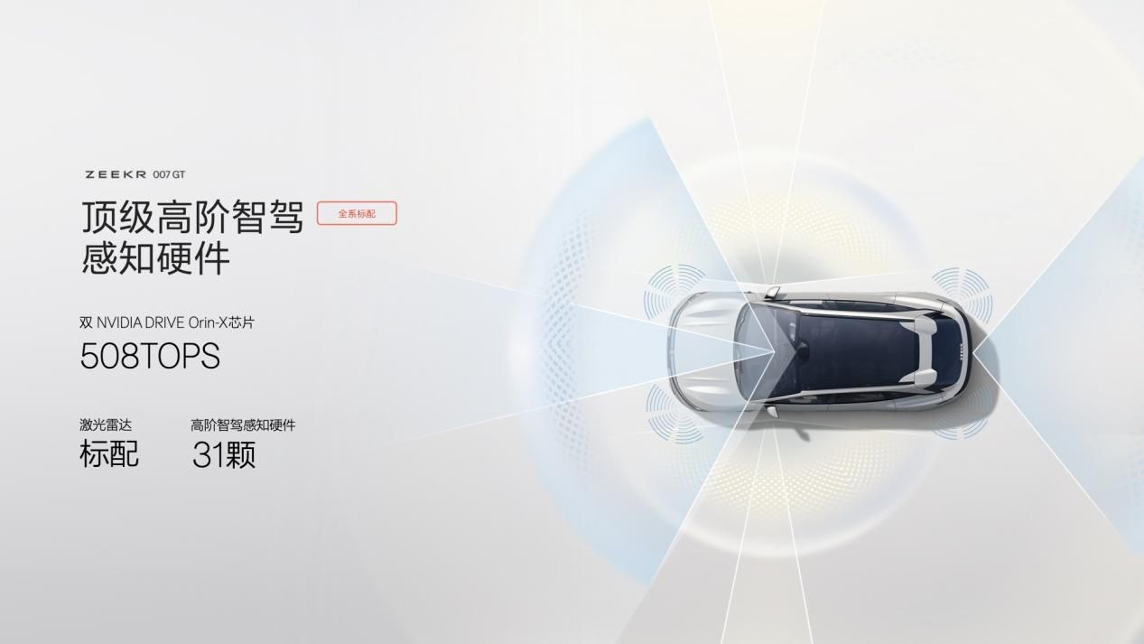 极氪007GT全系标配NVIDIA DRIVE双Orin-X芯片,算力高达508TOPS。全系标配激光雷达等31颗高阶智驾感知单元,在极端天气、光线骤变及异形障碍物等场景下感知精度更强,能提前100米发现静止车辆事故,安全冗余同级最强。在激光雷达加持下,截至2025年3月底,极氪千里浩瀚智驾AEB功能已成功帮助车主有效化解361.3万次碰撞风险。