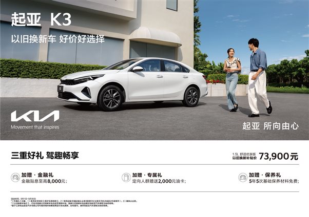 日前,悦达起亚9月购车钜惠活动正在火热进行中。即日起至9月30日,消费者购买起亚新K3,即可享限时促销和以旧换新补贴组合权益,以官方指导价114,400元的1.5L舒适优享版为例,以旧换新补贴价73,900元。此外,消费者购车还可加享至高8,000元金融贴息、定向人群赠送2,000元油卡,以及5年5次基础保养材料免费等专享权益。