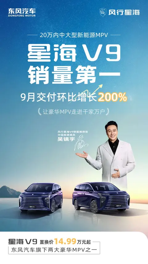 9月刚过,东风风行就交出了一份闪亮的热销成绩单——9月交付10092台,销量同比增长55%,环比增长56%。其中,旗下热门车型星海V9 的9月交付环比激增200%,更以“20万内中大型新能源MPV销量榜第一”“热门MPV用户口碑评分第一”“20万内自主MPV关注榜第一”的成绩,一举斩获汽车之家、易车、懂车帝三大权威平台MPV口碑榜榜首,实现“三冠”加冕。这波“现象级逆袭”势头,可谓是让大家看到了什么叫热力全开的“金九银十”。