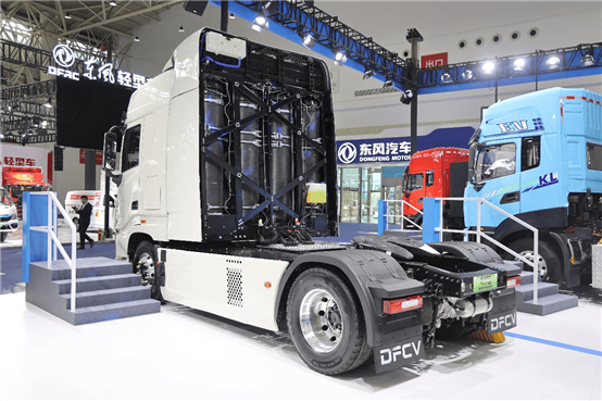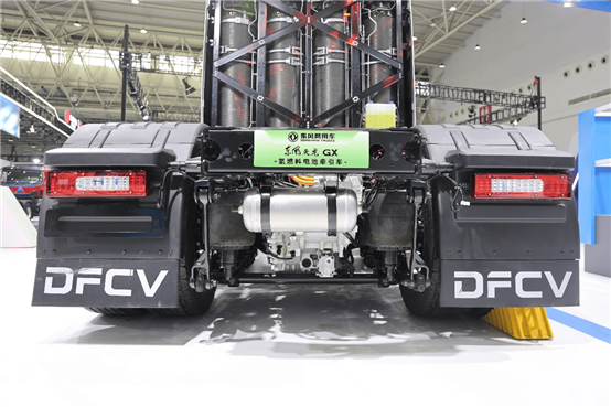 东风天龙GX氢燃料电池牵引车采用大功率高效燃料电池系统,功率190kw,逆反应转化效率>48%,可以理解为消耗同样的氢气这个系统的发电量会更大。续航方面,车辆标配4个353L的储氢瓶,搭配99度磷酸铁锂电池,实现加氢20分钟,续航超700km的表现,运营效率媲美柴油车。