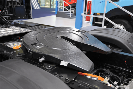 氢燃料电池牵引车本质上其实还是个电车,而为了优化底盘布局,提升车辆传动效率,东风天龙GX氢燃料电池牵引车采用了大功率电驱桥的配置。驱动形式用的是欧洲人喜欢的4X2,但是东风用的是单桥双电机的解决方案,单电机额定功率205kw,峰值功率265kw,双电机的峰值功率最大可达720马力,对于用惯大马力车型的欧洲用户而言,这个动力也是第一梯队的体验了。
