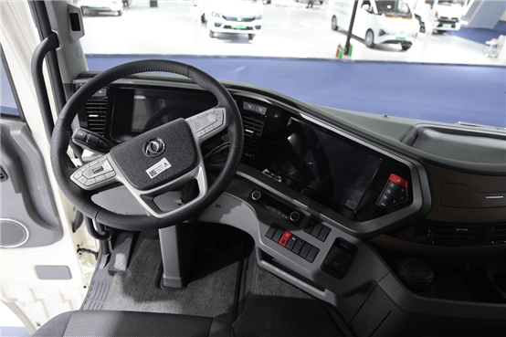 驾驶室内是东风打造的智能座舱,液晶仪表+液晶大屏,方向盘采用多功能样式,工作台环绕造型,还有自动空调、电子手刹、怀挡换挡等配置。为了符合欧洲人的使用喜欢,东风天龙GX还可以选配酒精锁、盲区提示器等配置。