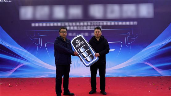 东风商用车有限公司总经理助理兼营销事业部总经理刘翼(右)为客户赠送车模