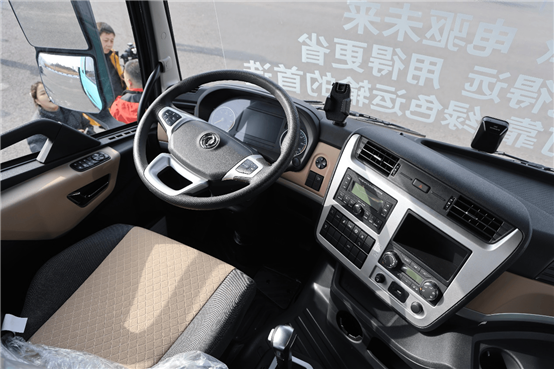 内饰还是D320平台经典的内饰风格,三幅式多功能方向盘,环绕式工作台,非常便利驾驶员的操作。在天龙KL电动牵引车上还标配PTC水暖的功能,升温快,不干燥、体感佳。