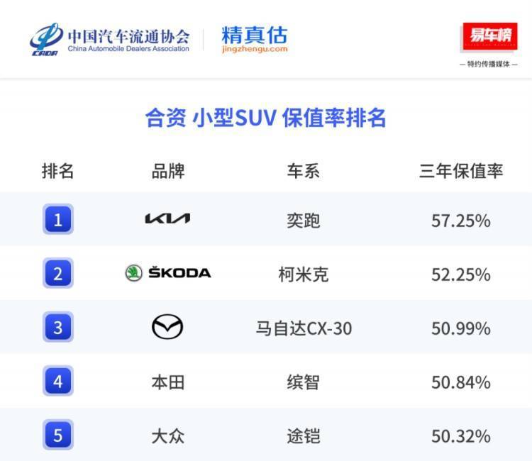 中国汽车流通协会联合精真估发布的《2025年度中国汽车保值率研究报告》显示,起亚奕跑三年保值率达57.25%,位列合资品牌第一、全系车型第二,反映出市场对其产品品质的认可。